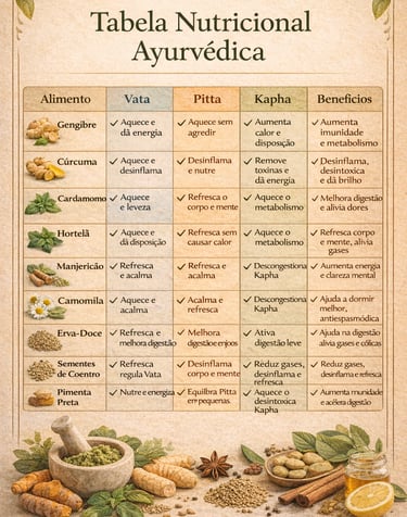 Especiarias como gengibre, cúrcuma, cominho, coentro e funcho são utilizadas para estimular digestão e reduzir inflamações. O famoso chá CCF (cominho, coentro e funcho) é amplamente usado em clínicas ayurvédicas para equilibrar o sistema digestivo.